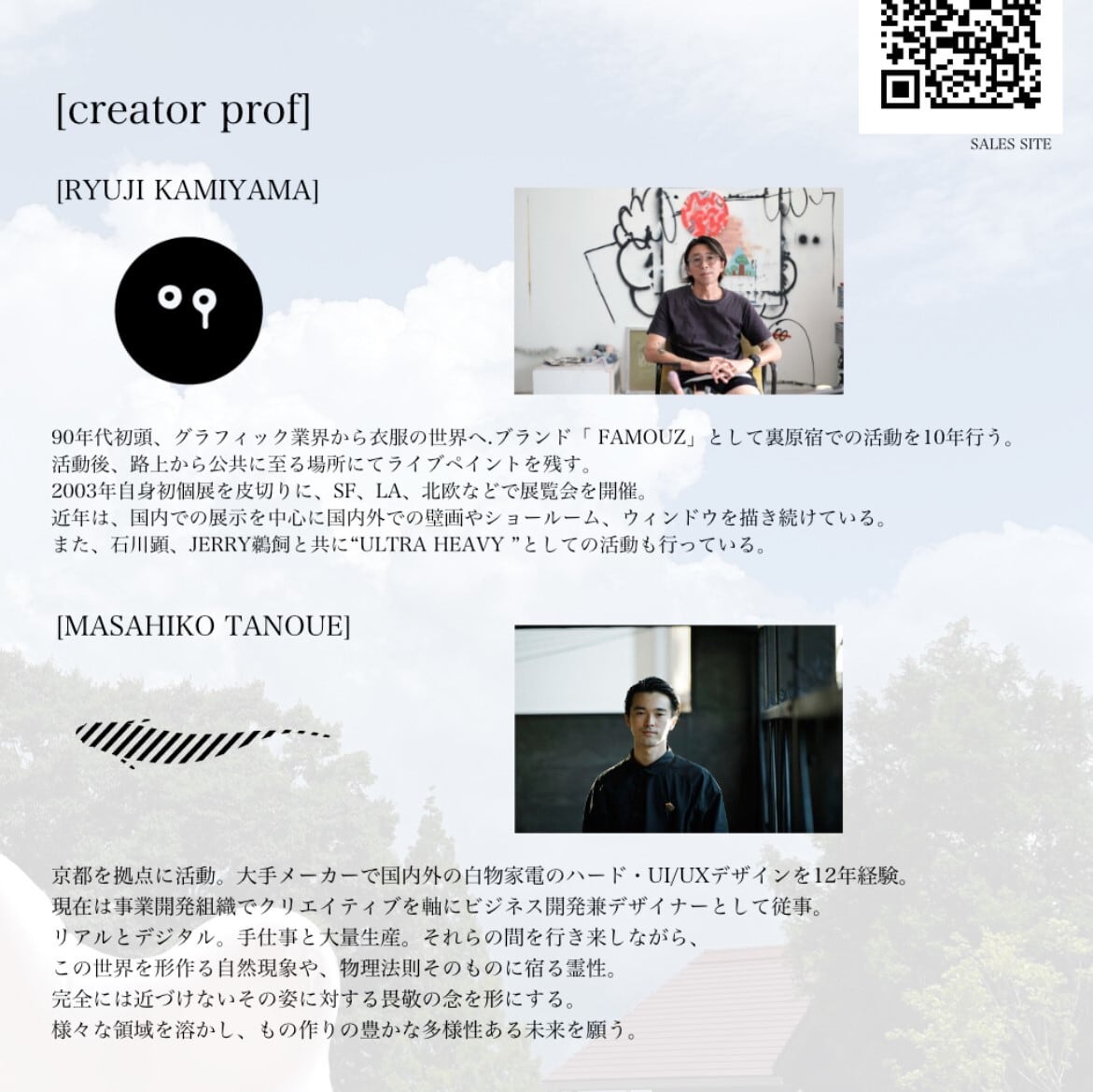 90年代初頭、グラフィック業界から衣服の世界へ。ブランド「FAMOUZ」として裏原宿での活動を10年行う。活動後、路上から公共に至る場所にてライブペイントを残す。2003年自身初個展を皮切りに、SF、LA、北欧などで展覧会を開催。近年は、国内での展示を中心に国内外での壁画やショールーム、ウィンドウを描き続けている。また、石川顕、JERRY鵜飼と共に“ULTRA HEAVY ”としての活動も行っている。